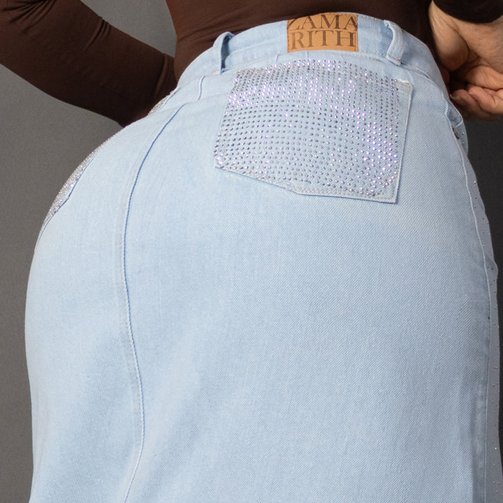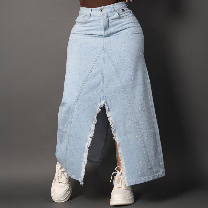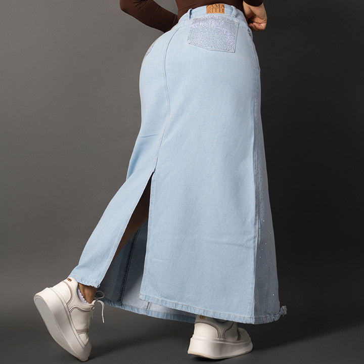 Su denim claro con pequeñas incrustaciones brillantes crea un efecto angelical y sutil, mientras su silueta larga y elegante estiliza la figura sin perder comodidad.