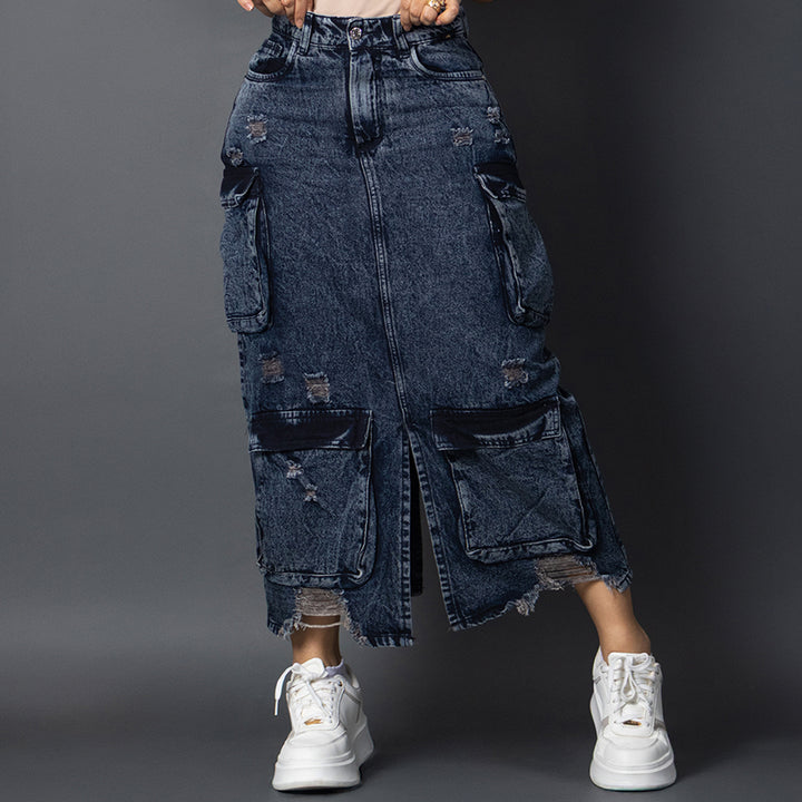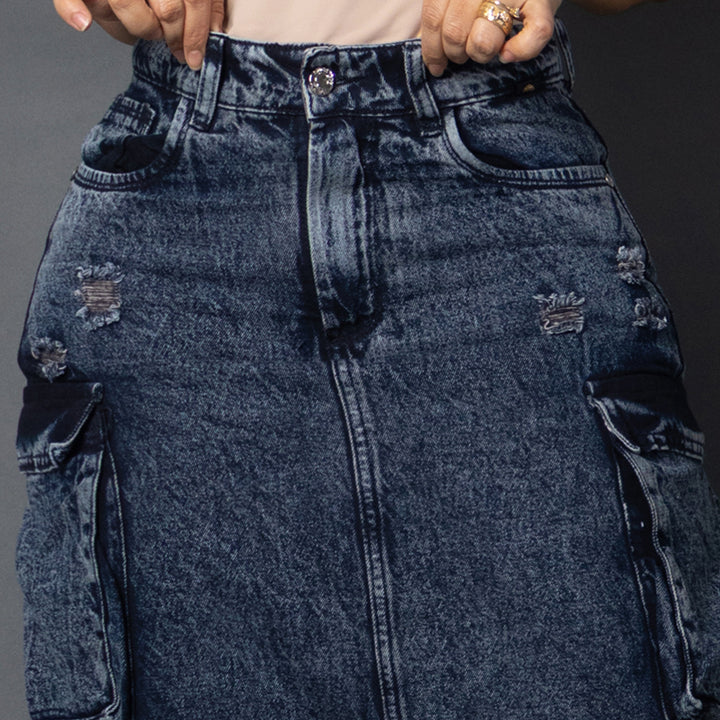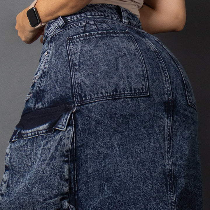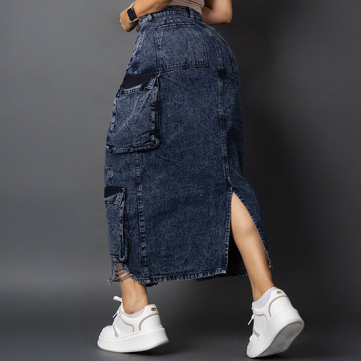 Su diseño en denim oscuro con bolsillos utilitarios, detalles desgastados y una caída larga impecable crea una prenda fuerte, moderna y versátil, perfecta para looks modestos sin renunciar a la moda.