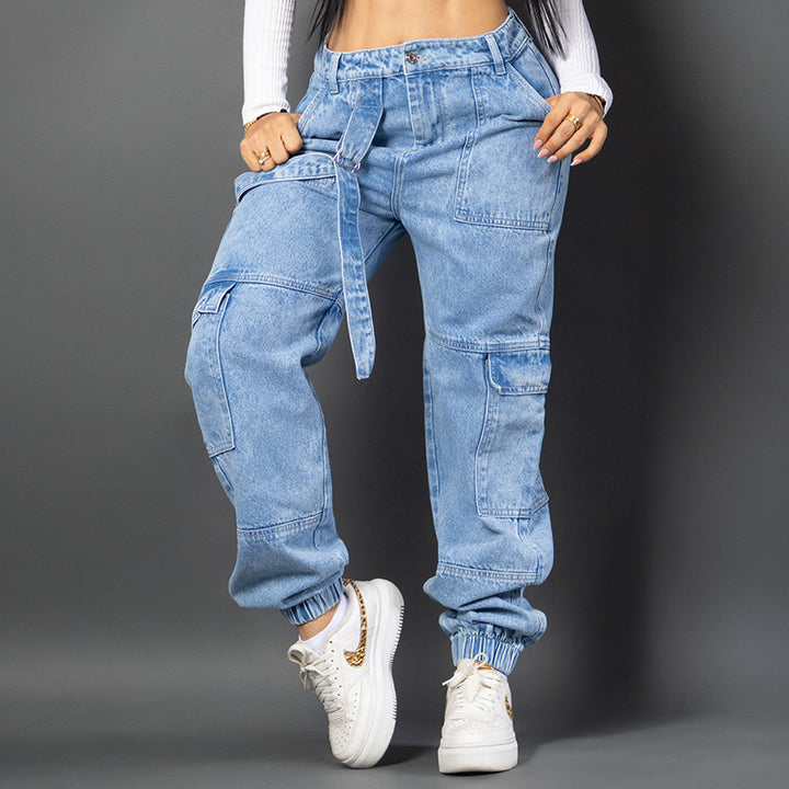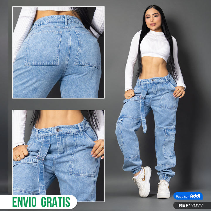 Jean cargo bota jogger en denim azul claro. Tiro alto, bolsillos utilitarios y silueta moderna que mezcla comodidad con estilo urbano. Perfecto para un look auténtico y empoderado. 🚀👖