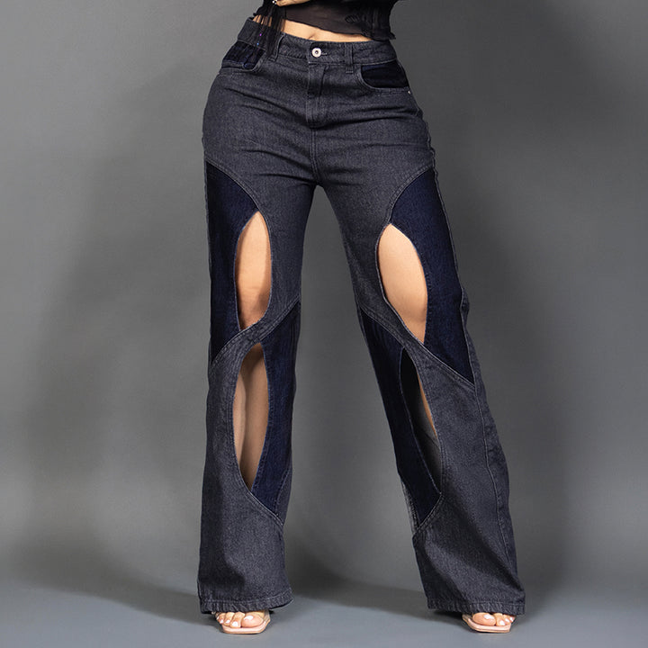 Este jean no es solo moda, es poder en movimiento. Confeccionado en denim negro con contraste en azul oscuro, tiene un tiro alto que estiliza tu figura, aberturas frontales que realzan tus piernas y una bota ancha que aporta elegancia y seguridad.