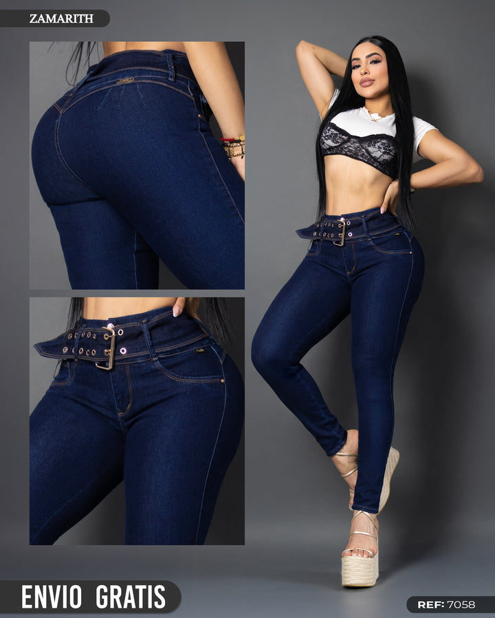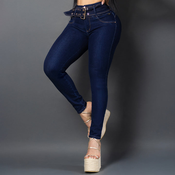 El Jean Belted Power combina la elegancia del denim azul oscuro con una silueta skinny de tiro alto que realza tus curvas y define tu cintura con su faja tipo cinturón incorporada, ajustable y con herrajes metálicos dorados.