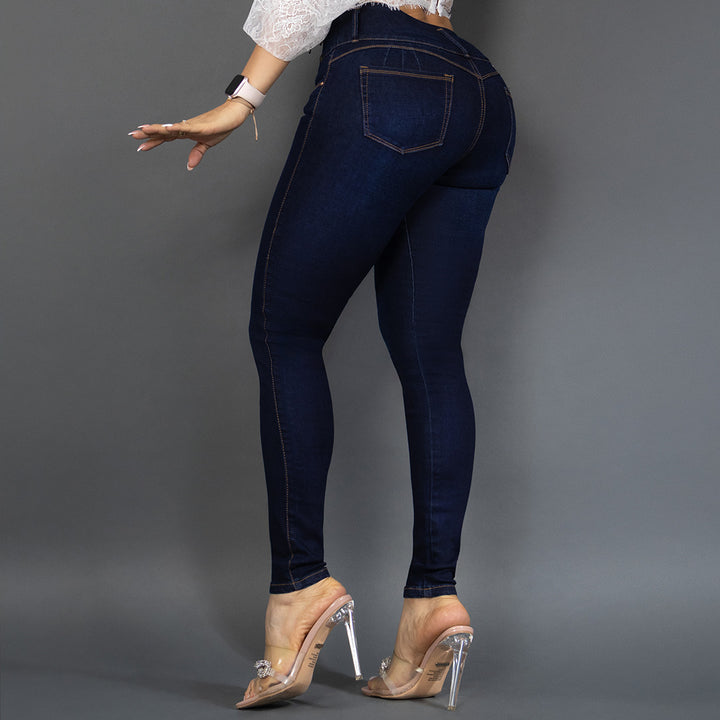 El Jean Sculpt Elegance está confeccionado en denim premium de alto poder de ajuste, diseñado para realzar tus curvas y definir tu cintura con su estructura de tiro alto y triple botón metálico.