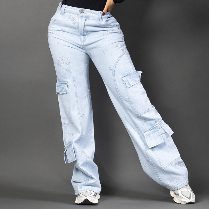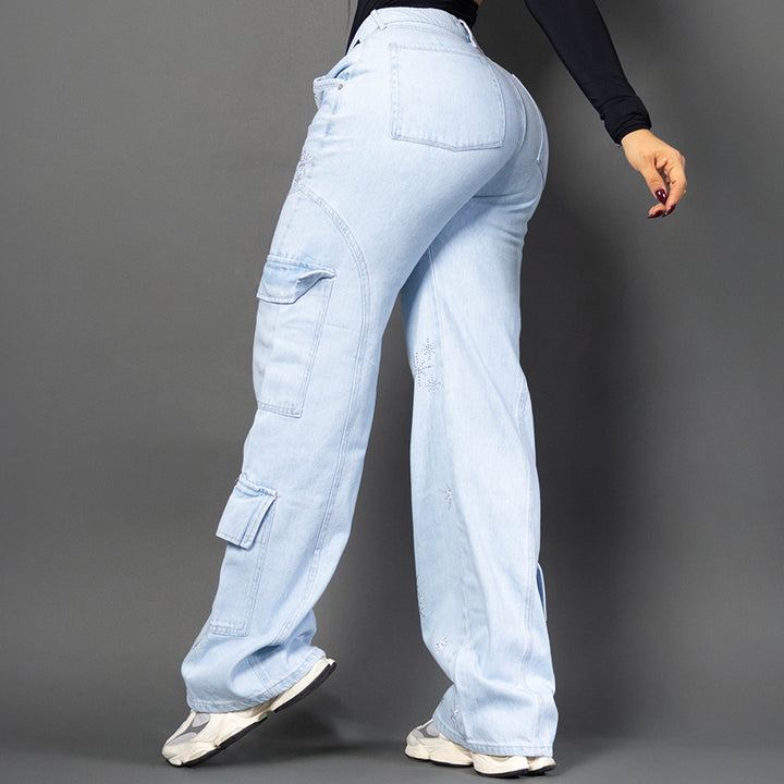 Jean cargo bota ancha en denim azul claro con detalles bordados en pedrería. Tiro alto, silueta moldeadora y bolsillos funcionales que combinan comodidad y estilo.