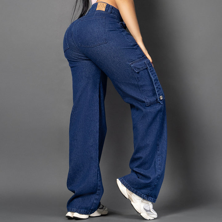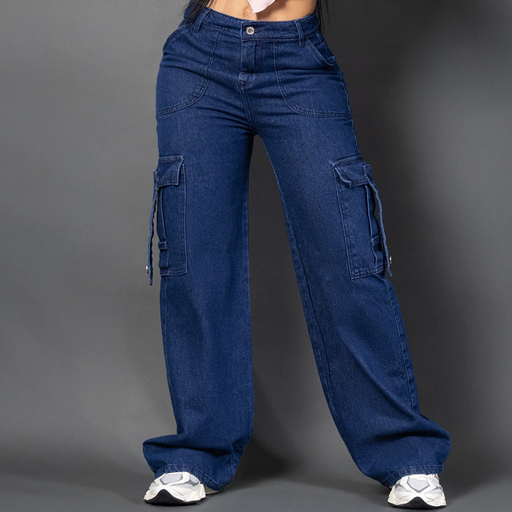 Jean cargo bota ancha en denim azul oscuro. Tiro alto, bolsillos utilitarios y fit relajado que equilibra estilo, comodidad y actitud