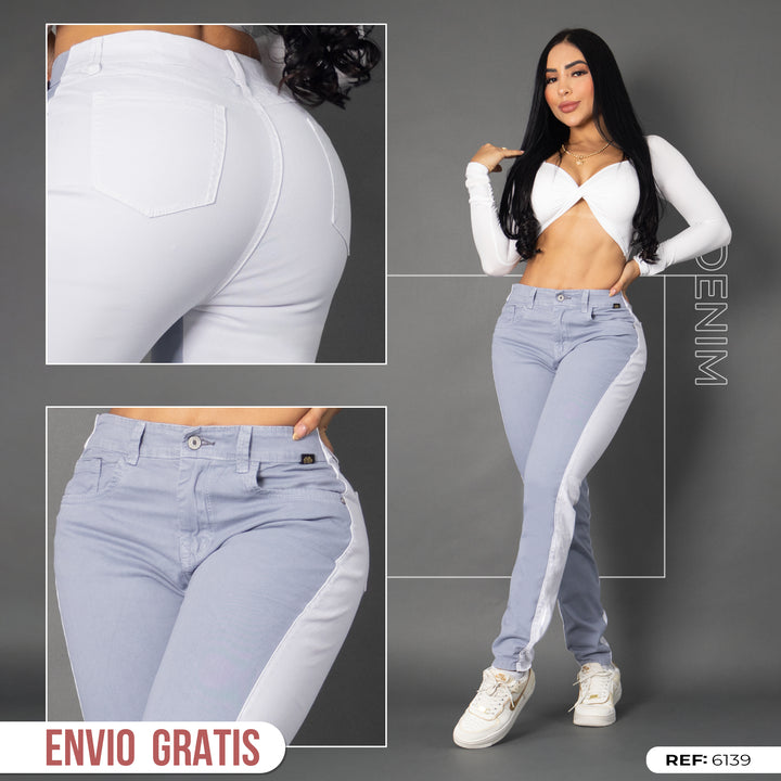 Jeans doble color clásico Ref. 6139 TELA PREMIUM para dama, con diseño exclusivo que combina dos tonos de denim en una sola prenda. Confeccionados en tela de alta calidad, con corte recto y ajuste cómodo que estiliza la figura. Una propuesta original y versátil, ideal para looks modernos y llenos de estilo.