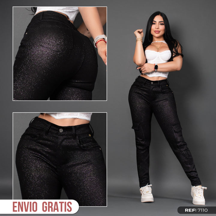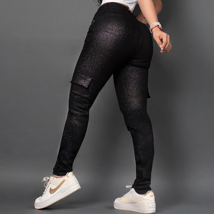 Un jean que roba miradas 🔥. Su tono negro con acabado brillante, corte tipo cargo y ajuste perfecto lo convierten en la opción ideal para brillar de día o de noche. ¡Estilo y poder en una sola prenda! Envío gratis incluido.