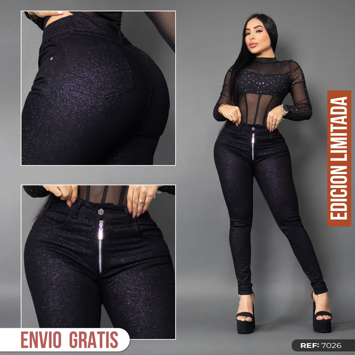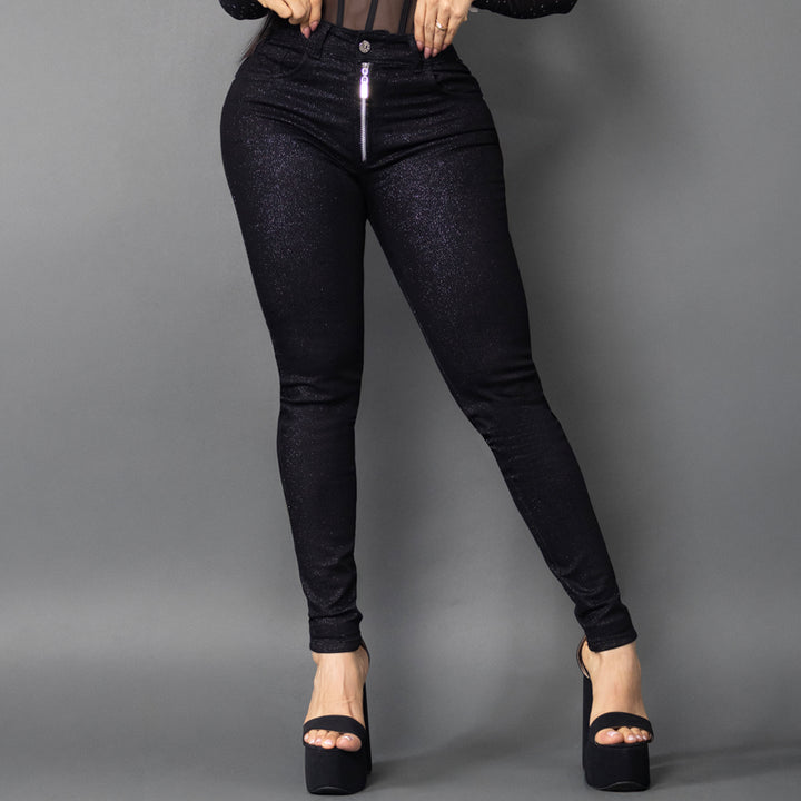 Jeans con tela brillante edicion limitada elaborada con los mejores materiales del mercado en tono oscuro con cierre de lujo