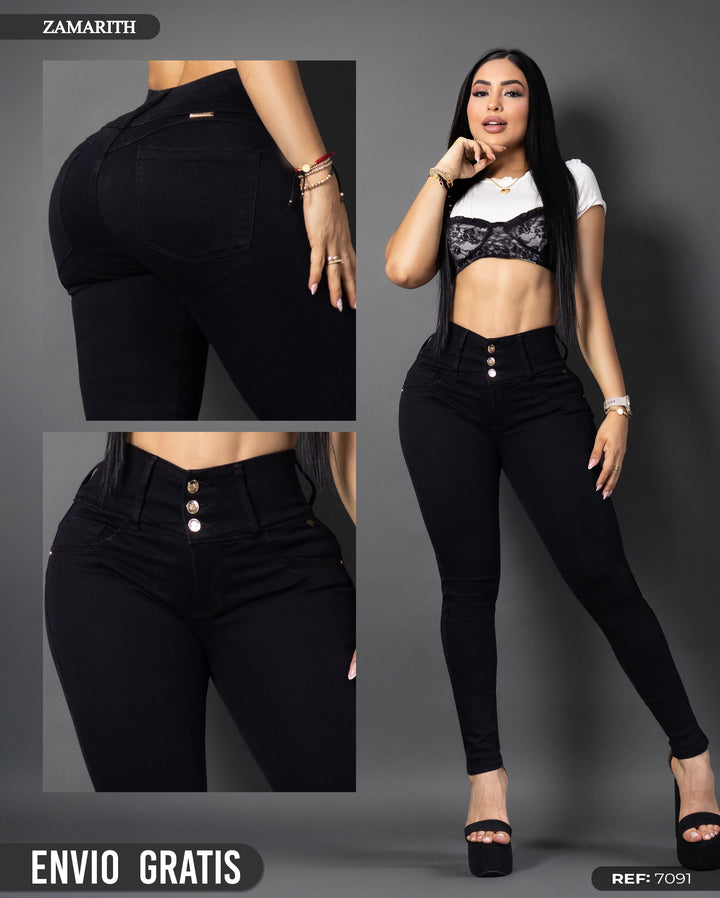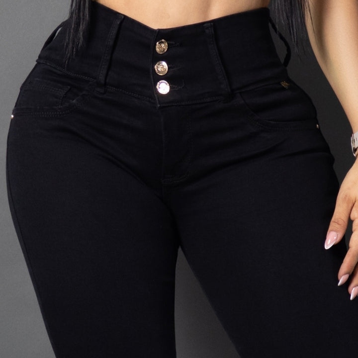 Este jean skinny de tiro alto está confeccionado en denim negro premium con control de abdomen y realce natural, logrando una silueta estilizada, firme y elegante.