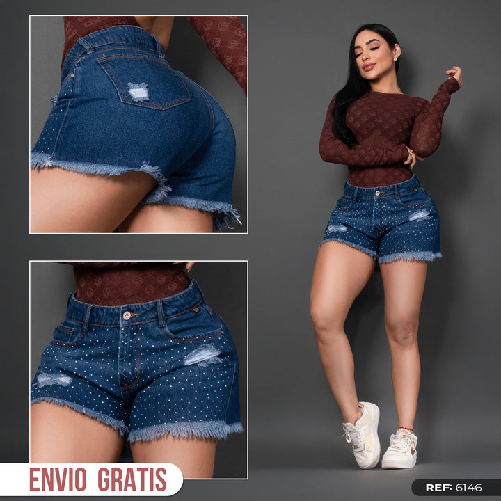 Dale un toque atrevido y glam a tu outfit con este short en denim oscuro, con efecto desgastado, taches brillantes y ruedo desflecado. Perfecto para resaltar tus curvas con estilo y comodidad. ¡Incluye envío gratis!