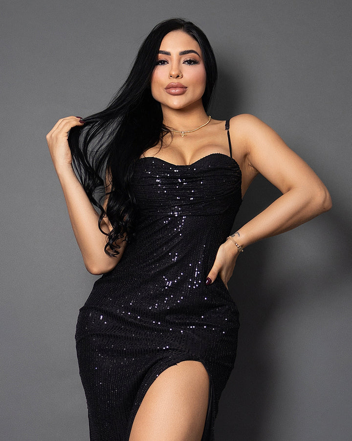 Confeccionado en tela negra con lentejuelas, su diseño midi ajustado con abertura lateral estiliza la figura y aporta un aire sofisticado y atrevido al mismo tiempo.